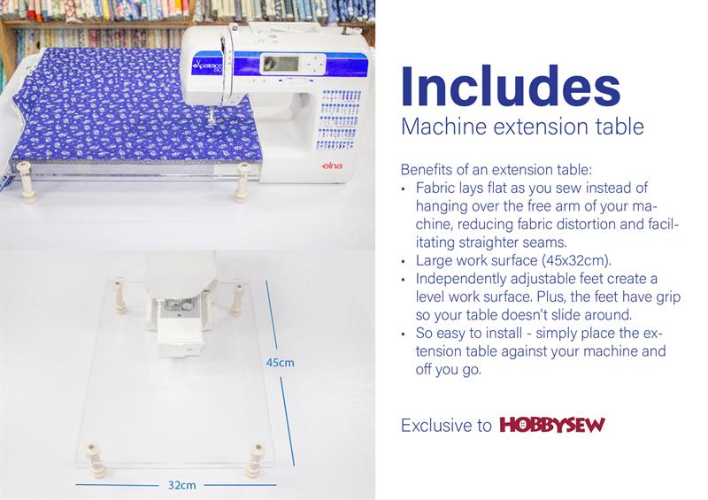 Bonus Elna 510 Extension Table Bonus Items - 10-Piece Presser Foot Set and Shears - 7mm Valued at $200 1 x Dressmaking Scissor PN 900475000 $40 | Bonus Items may be changed to equal or better value (depending on availability)